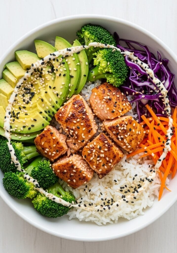 For a lighter option, try making a crispy salmon bowl air fryer style with mixed greens, cucumber, avocado, and a tangy lemon-tahini dressing. Add some pickled red onions if you’re feeling fancy.