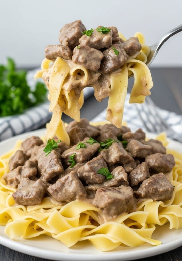 Substitutions: No stew meat? Use ground beef for ground beef stroganoff crockpot version – just reduce cooking time to 4-5 hours on low. Can’t find sour cream? Greek yogurt works, though add it at the very end off heat. For gluten-free, swap flour with cornstarch (use 2 tbsp mixed with cold water).