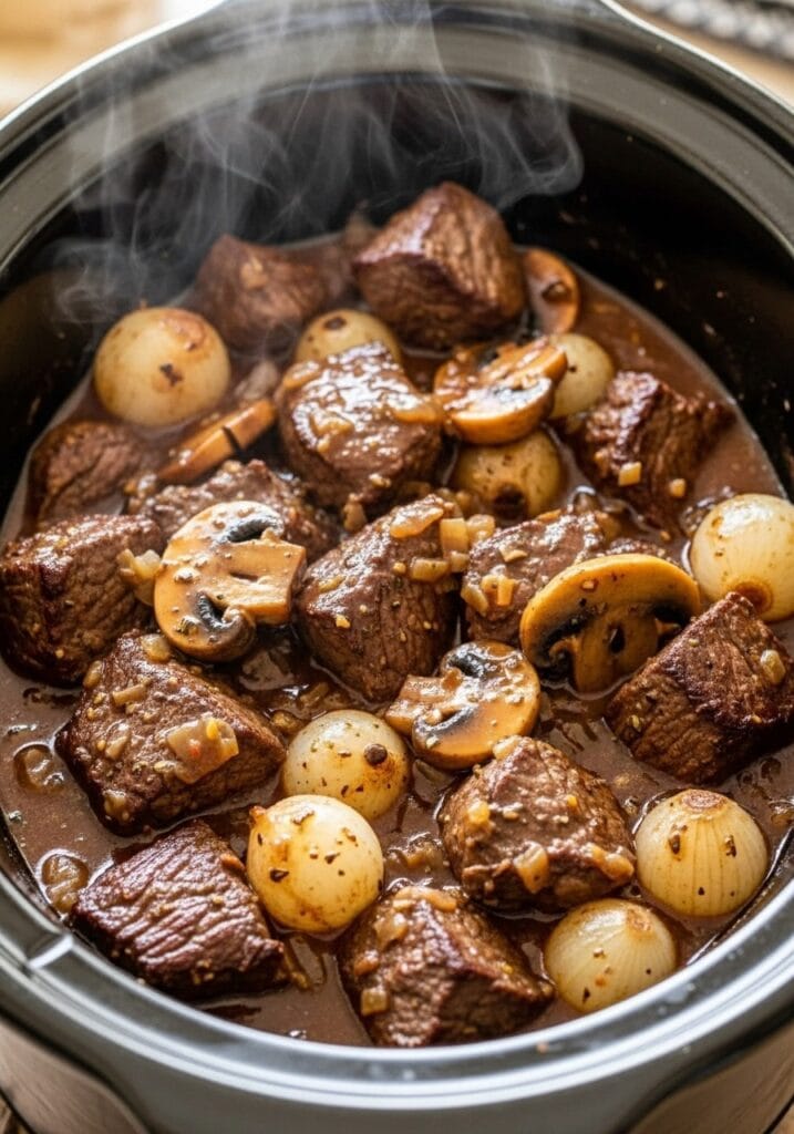 Use 2 lbs ground beef (85/15 works best). Brown it completely in a skillet with the onions, breaking it into small crumbles. Drain excess fat. Transfer to crockpot with mushrooms, garlic, and all the sauce ingredients except sour cream. Cook on LOW for 4-5 hours instead of 6-8. The shorter time works because ground beef is already tender. Add the flour slurry and sour cream exactly as directed in steps 6-7.