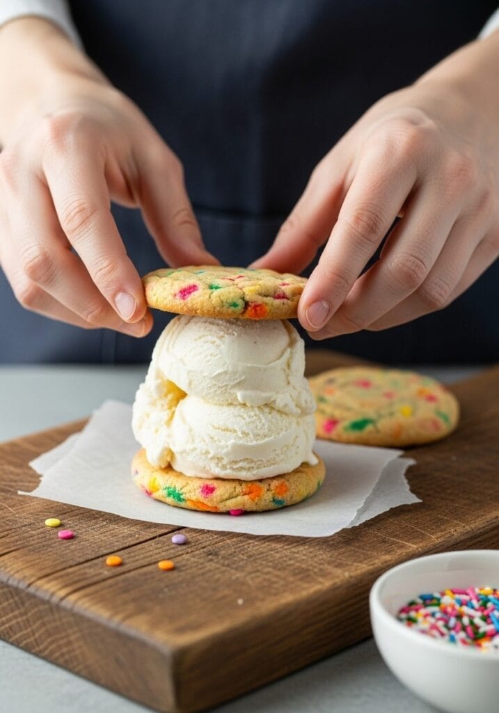 These sandwiches take about 30 minutes of active work, and they’re beginner-friendly. The cookies stay soft even after freezing, and the ice cream doesn’t melt too fast. They taste like a party – sweet, creamy, and bursting with sprinkles. If you’re looking for something that feels special without the stress, this is it.