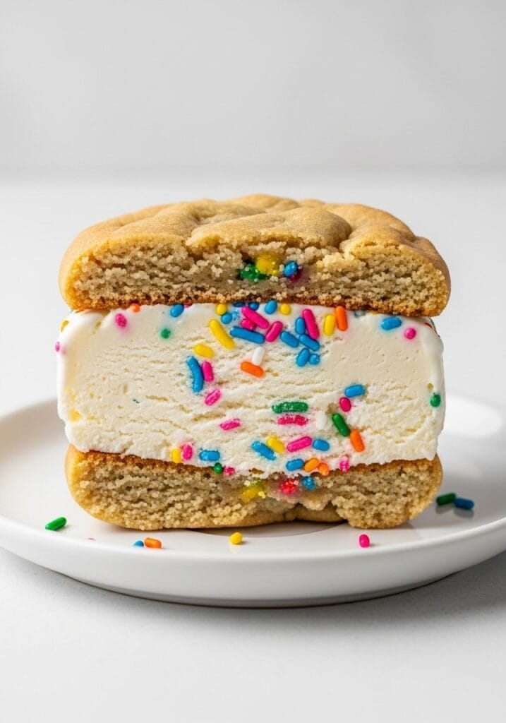 Birthday cake ice cream sandwiches bring together two beloved desserts into one handheld treat. The cookies are tender and cake-like, not crunchy, which makes them perfect for biting into when frozen. The rainbow sprinkles add that festive birthday cake flavor without needing actual cake.