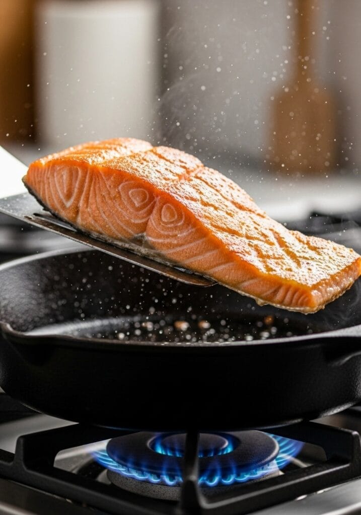 Flip carefully with a spatula. Cook for another 3-4 minutes until the salmon reaches an internal temperature of 145°F (63°C). The center should be slightly translucent pink. Remove from heat and let rest on a plate.