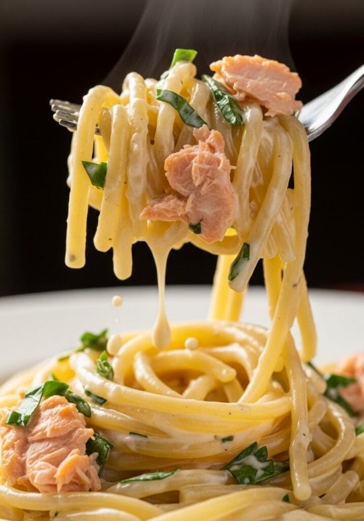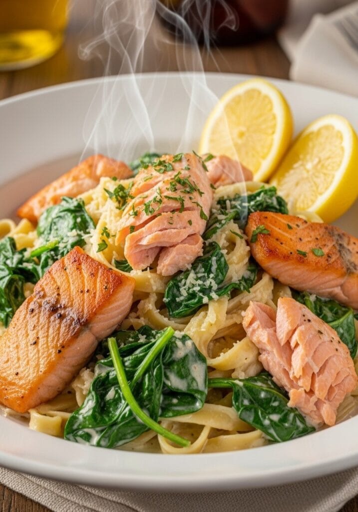 To reheat, warm the pasta gently in a skillet over low heat with a splash of cream or milk to revive the sauce. Heat the salmon separately in the microwave for 30-45 seconds or in a 300°F (150°C) oven for 8-10 minutes.