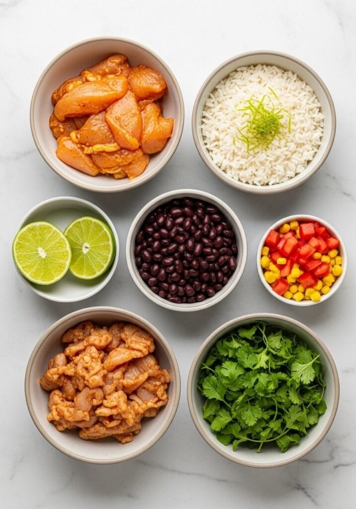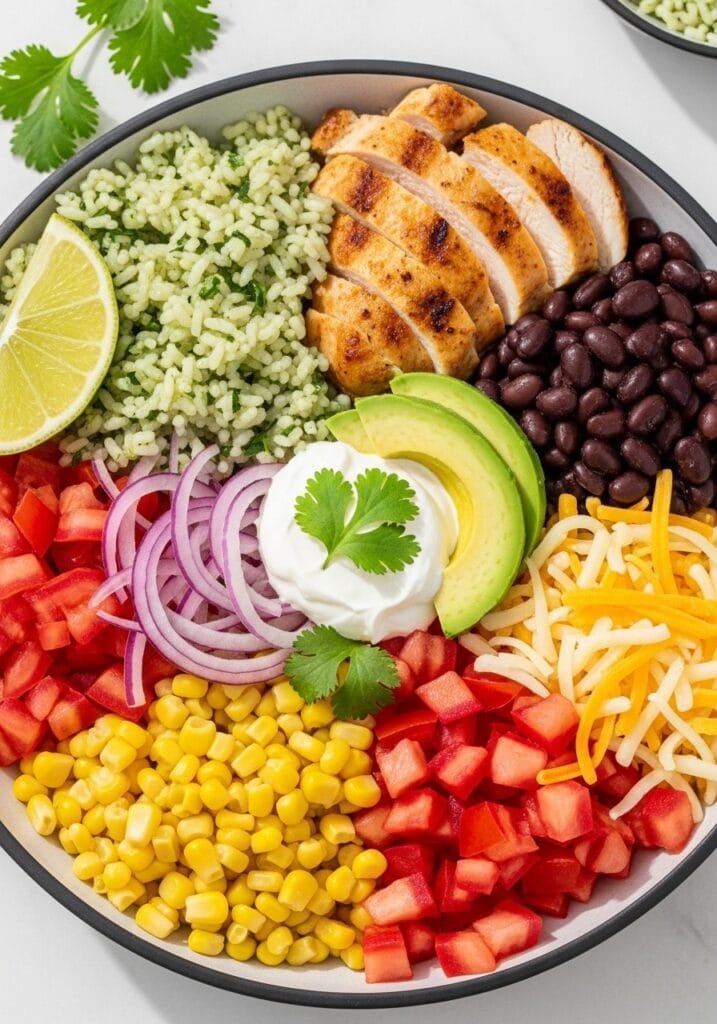 Start with a generous base of cilantro lime rice in each bowl – about 3/4 cup per serving. The rice creates a foundation that soaks up all the delicious juices from the toppings.