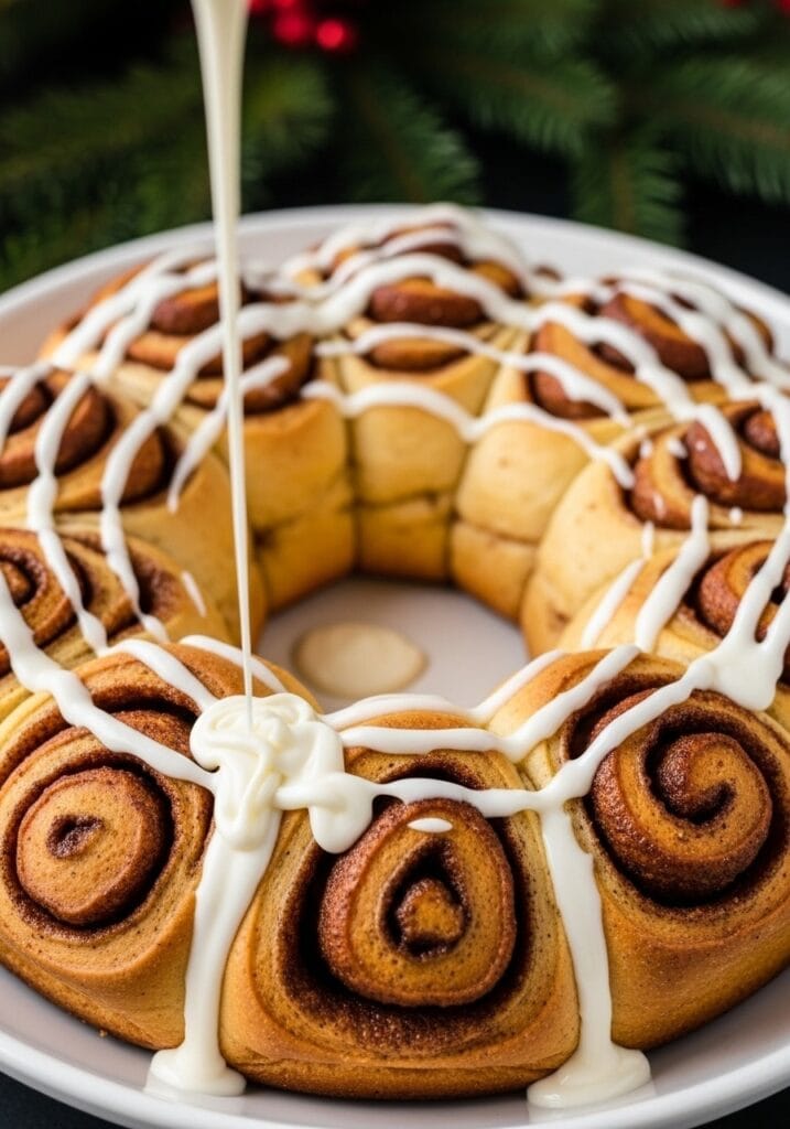This festive cinnamon roll wreath is one of those recipes that becomes a tradition. It’s impressive enough for special occasions but forgiving enough that even baking beginners can pull it off. The combination of soft, buttery dough, generous cinnamon filling, and tangy cream cheese frosting is basically Christmas morning in edible form.