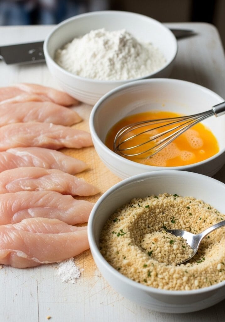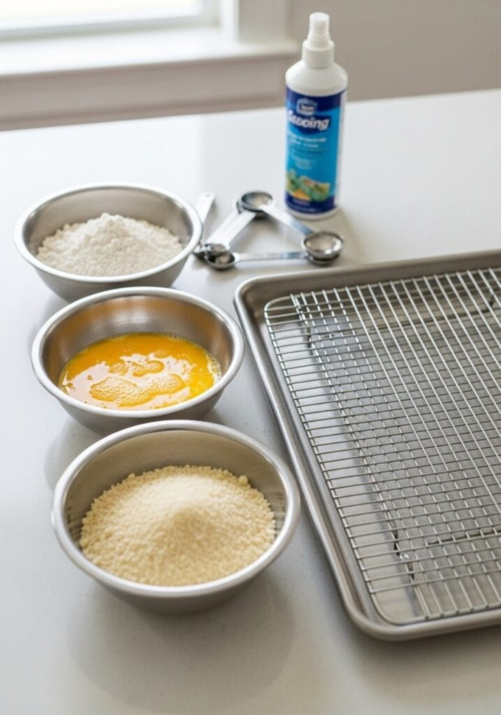 3. Set up breading station (3 minutes) Place flour in the first shallow bowl. In the second bowl, whisk together eggs and milk until well combined. In the third bowl, mix panko breadcrumbs, Parmesan cheese, garlic powder, onion powder, paprika, oregano, and ½ tsp salt. Stir until everything is evenly distributed.