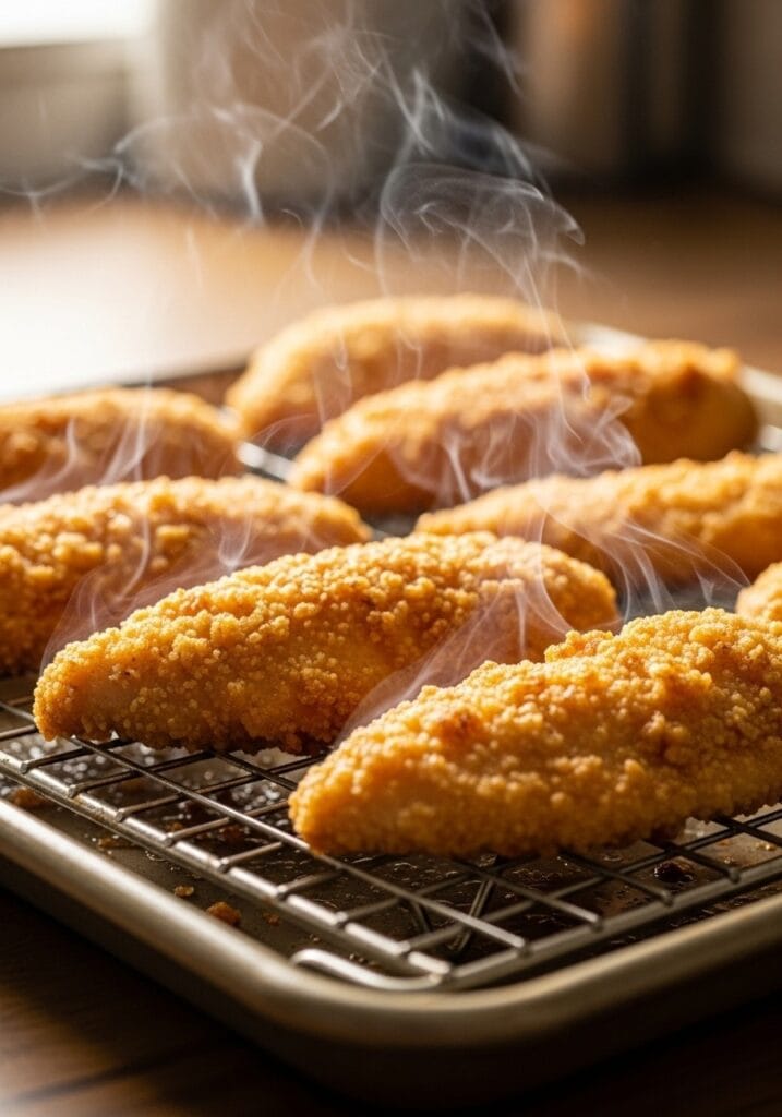 7. Rest and serve (2 minutes) Let the tenders rest on the rack for 2 minutes before serving. This allows the coating to set and stay extra crispy.