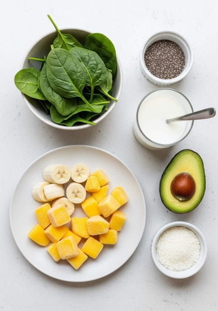 Substitutes: Use frozen pineapple instead of mango. Swap spinach with kale (though it’s slightly more bitter). Replace avocado with 2 tbsp Greek yogurt for creaminess. Any milk works – dairy, oat, or soy.