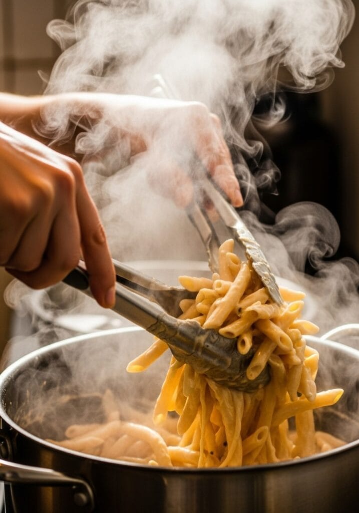 Step 12: Add the drained pasta to the pot. Using tongs, toss the pasta in the sauce for 1-2 minutes over low heat. Make sure every piece is coated. The sauce should cling to the pasta without pooling at the bottom.