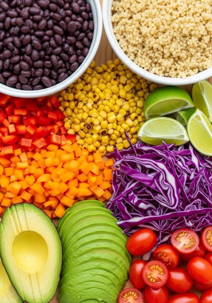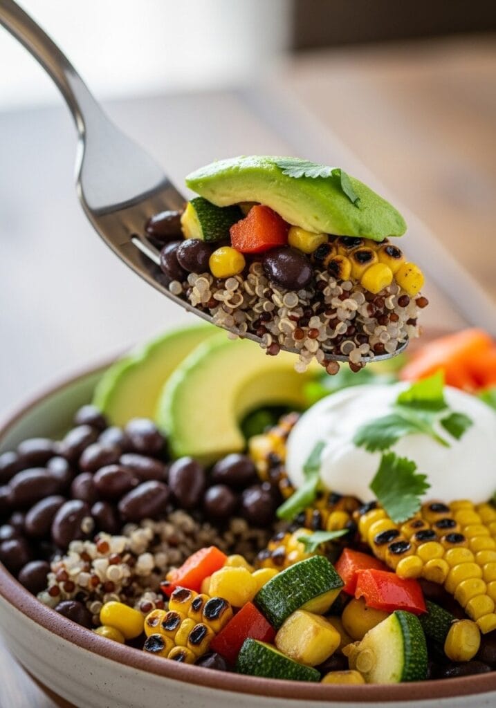 First, you’re seasoning the black beans with cumin, chili powder, and garlic until they taste like they came from a taqueria. The quinoa gets cooked in vegetable broth instead of water, which adds depth most recipes skip. Then you’re roasting the corn and peppers until they get those caramelized edges that make everything taste better.