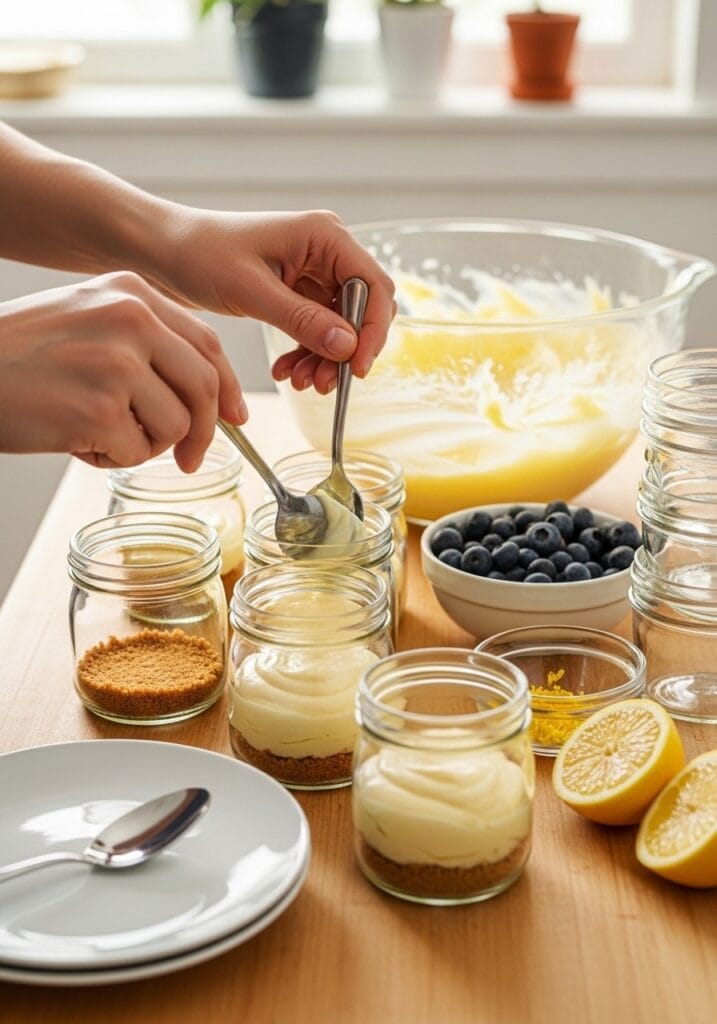 Spoon or pipe the lemon cheesecake filling over the graham cracker crust in each jar, filling them about ¾ of the way. Smooth the top with the back of a spoon or a small spatula. Add a generous spoonful of the blueberry topping over the cheesecake layer. If desired, sprinkle a few extra graham cracker crumbs on top for texture.