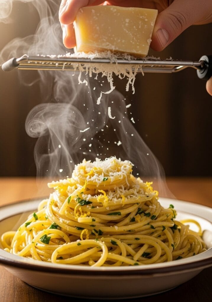 Step 16: Serve immediately in bowls. Top with remaining parsley, Parmesan, and extra lemon zest for a pop of color and fresh citrus aroma.