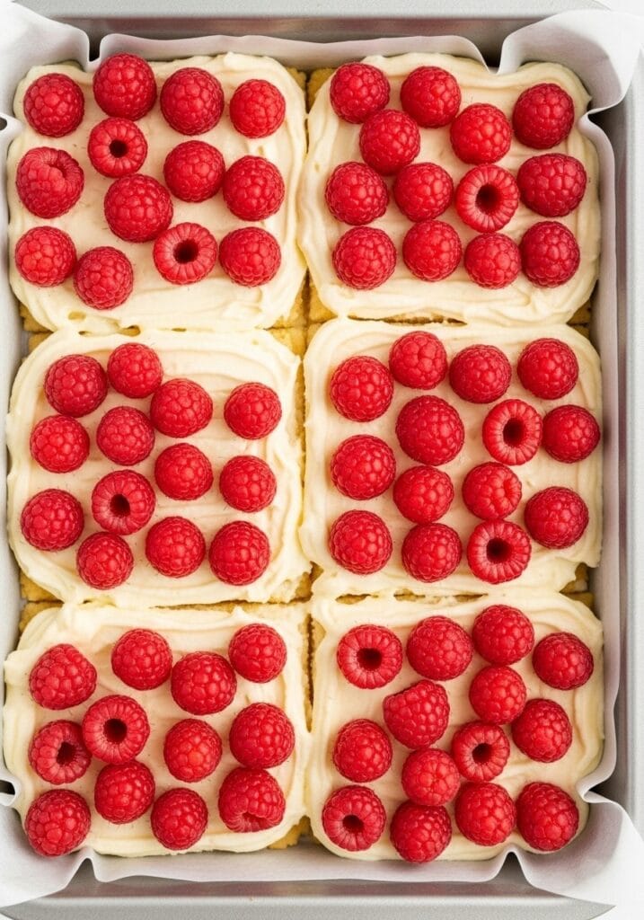 Scatter fresh raspberries evenly over the top of the cream cheese layer. Press them down very gently – just enough so they sit slightly into the filling but don’t sink completely.