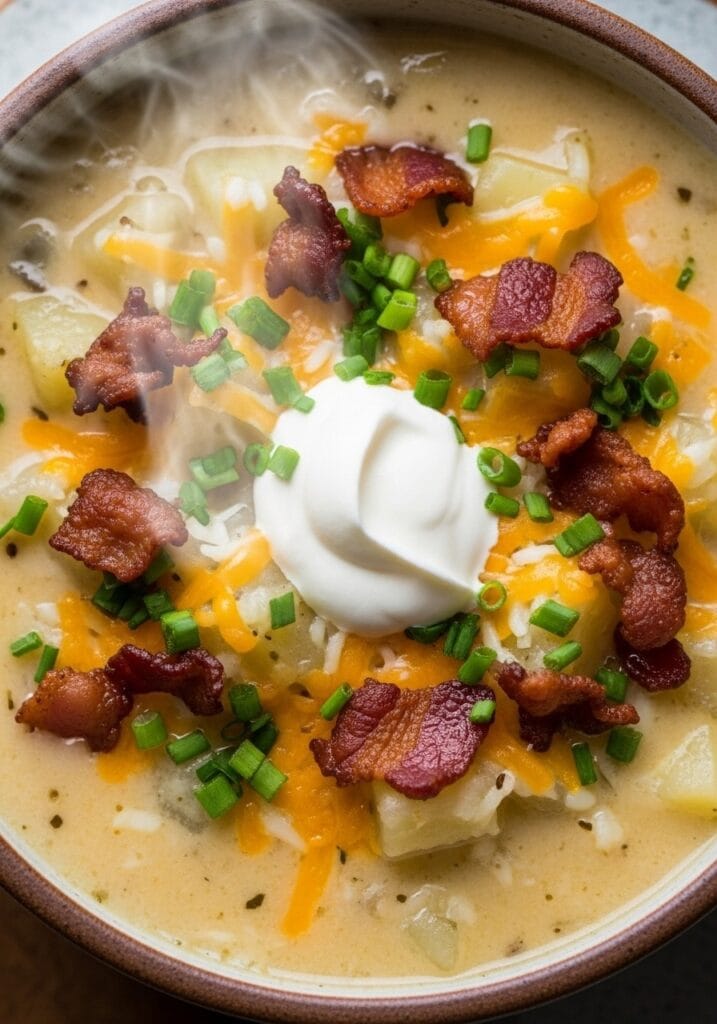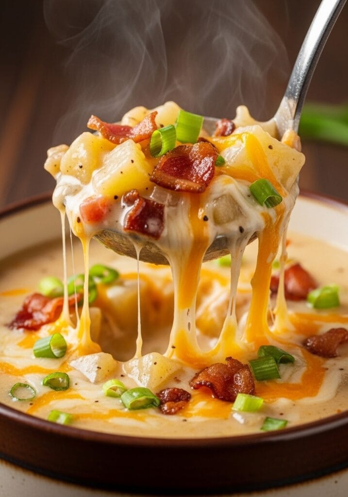 First, it’s comfort food at its finest. You get all the flavors of a fully loaded baked potato – crispy bacon, sharp cheddar, tangy sour cream, fresh chives – but in a spoonable, slurpable form that’s even more satisfying on a cold day.