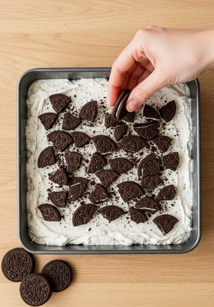 Take your 8-10 reserved Oreos and crush them into chunky pieces (not fine crumbs this time). Sprinkle them evenly over the top of the filling. Press them down very gently so they stick.