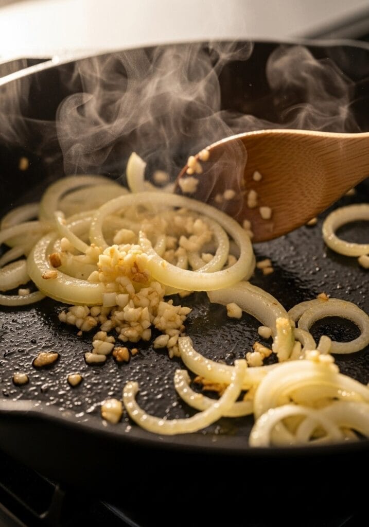 Lower the heat to medium. In the same pan (don’t wipe it out – those brown bits are flavor), add diced onion. Cook for 3-4 minutes, stirring occasionally, until softened and translucent. Add minced garlic and cook for 30 seconds until fragrant. If the pan looks dry, add a splash of broth to scrape up any stuck bits.
