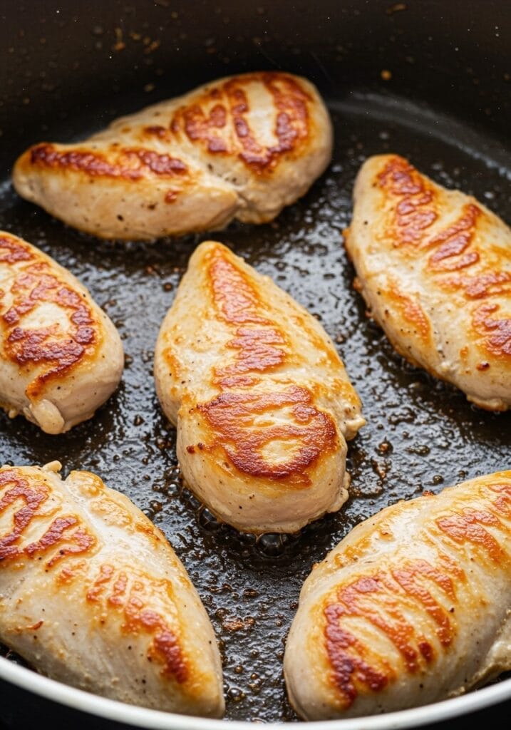 Step 3: Add the chicken pieces in a single layer. Cook for 4-5 minutes without moving them. Flip and cook another 3-4 minutes until golden brown. They don’t need to be fully cooked yet.
