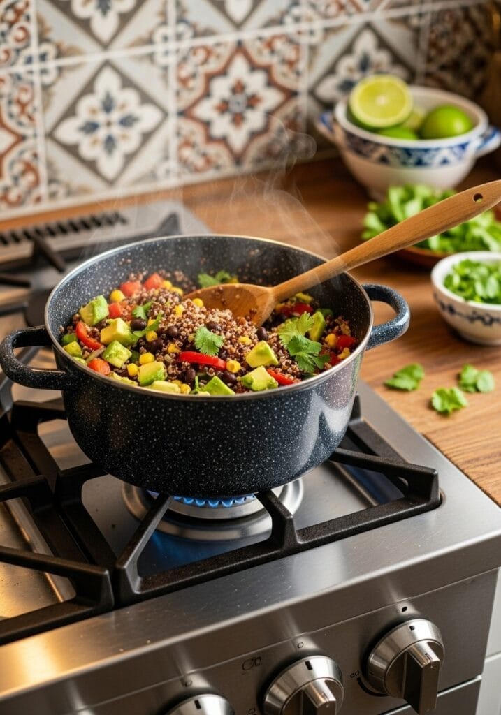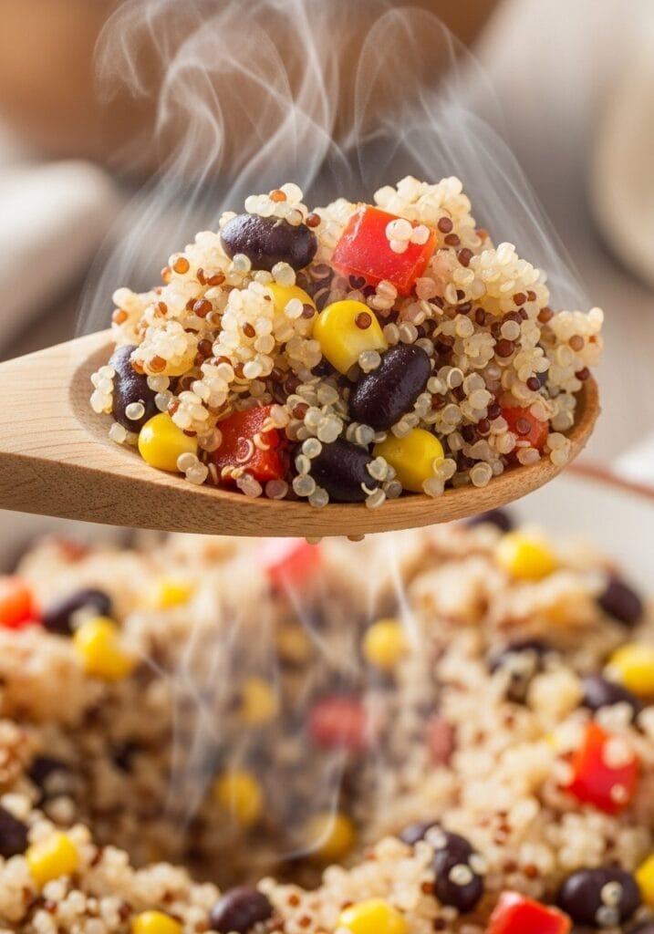 This isn’t your typical bland grain bowl. We’re talking smoky cumin, a hint of chili powder, juicy black beans, and sweet corn all mingling together in one beautiful pot. The quinoa soaks up a tomato-based broth that makes every bite taste like you spent hours on it. You didn’t. That’s the magic.