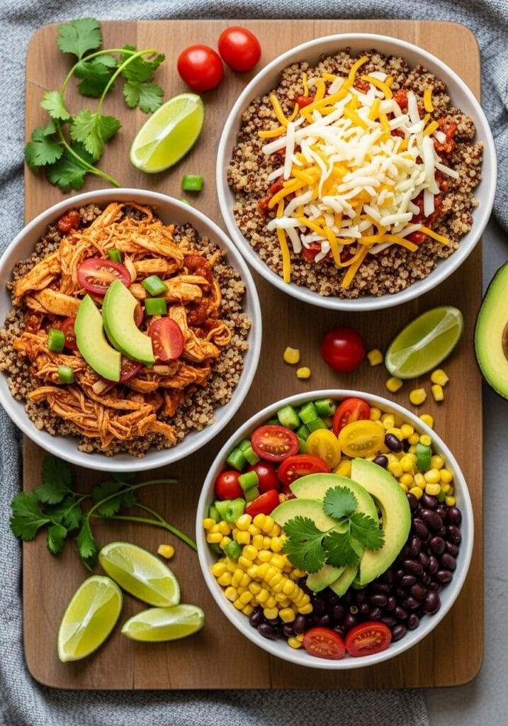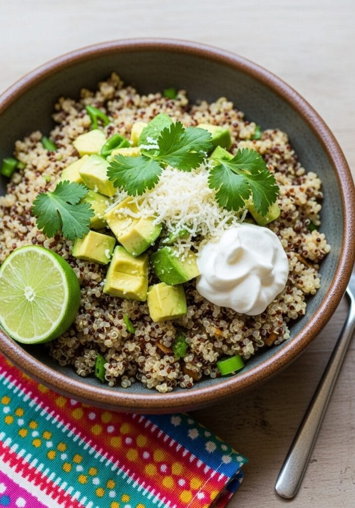 Cheesy Mexican quinoa bowl: Stir in 1 cup of shredded cheese right after cooking while it’s still hot. Mexican blend or sharp cheddar works great. Let it melt in, then top with more cheese because why not.