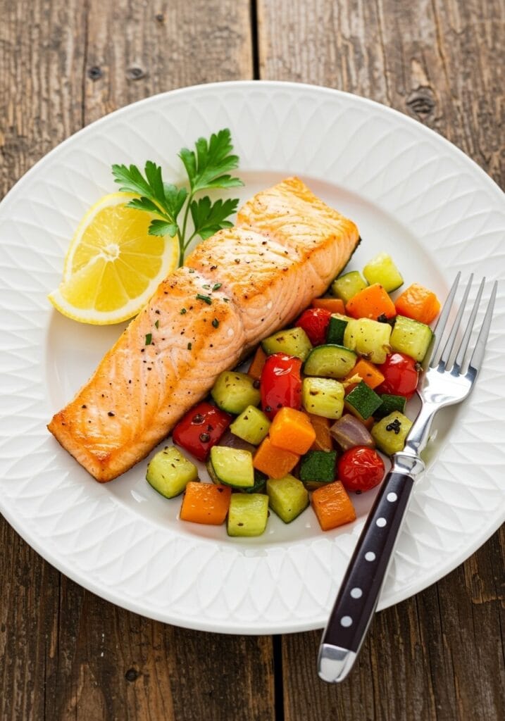 The nutritional profile here is genuinely impressive without trying too hard. Salmon brings omega-3 fatty acids, high-quality protein, and vitamin D. The vegetables add fiber, vitamins, and minerals. A serving delivers roughly 450 calories with about 30g of protein – enough to keep you satisfied without that heavy, overstuffed feeling.