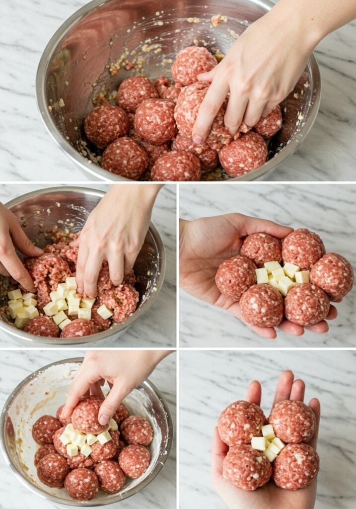 Divide the mixture into 12 equal portions (about 60g each). Flatten each portion in your palm, place a mozzarella cube in the center, and wrap the meat around it. Roll into a smooth ball, making sure the cheese is completely sealed inside. This prevents cheese from leaking out during cooking.