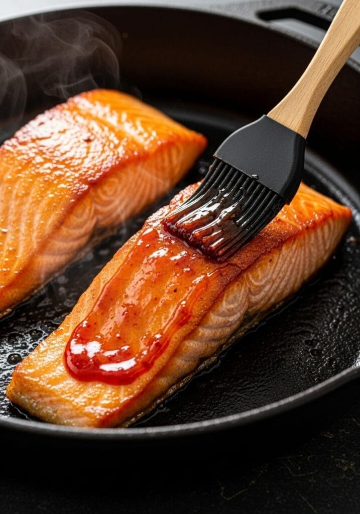 Flip the salmon again. Brush the second side with more glaze. Cook for 2 minutes. Flip one more time and add a final layer of glaze to the top. The glaze should look sticky and caramelized at this point.